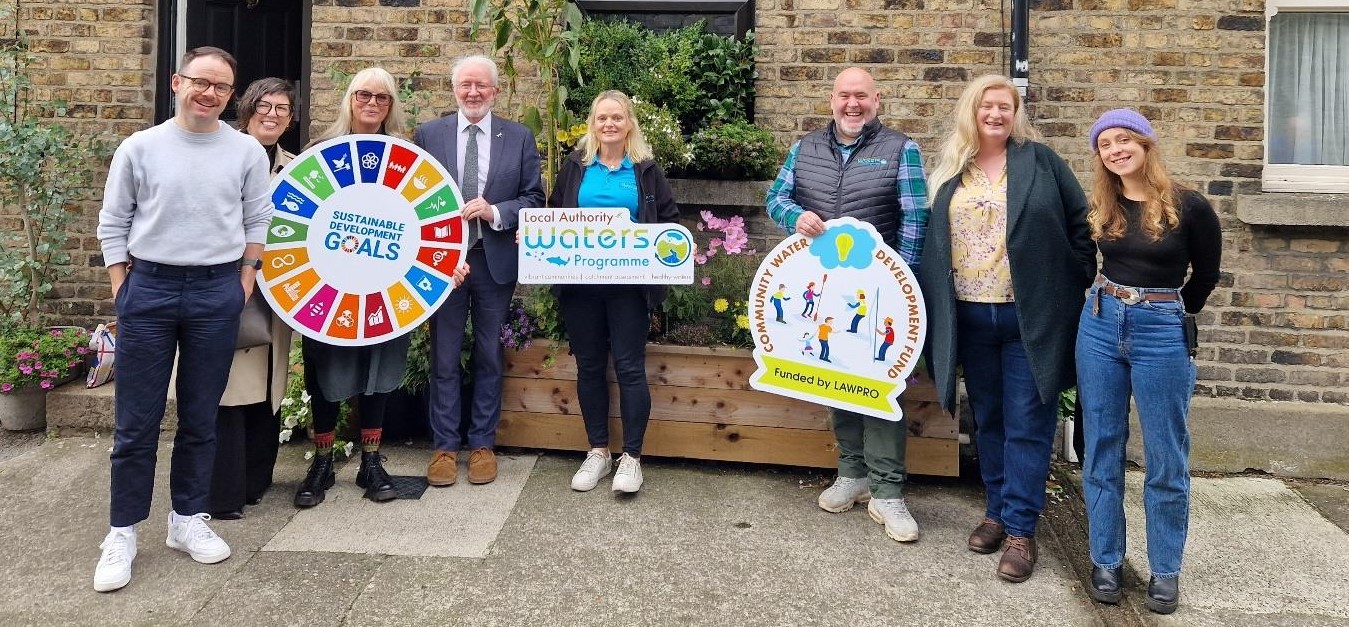 Minister Malcom Noonan, TD at the official launch of the Community Water Development Fund 2024 on behalf of the Local Authority Waters Programme (LAWPRO). The Minister is pictured with Margaret Keegan, Regional Coordinator, LAWPRO along with LAWPRO staff, local Stoneybatter residents and representatives from Bí Urban social enterprise.