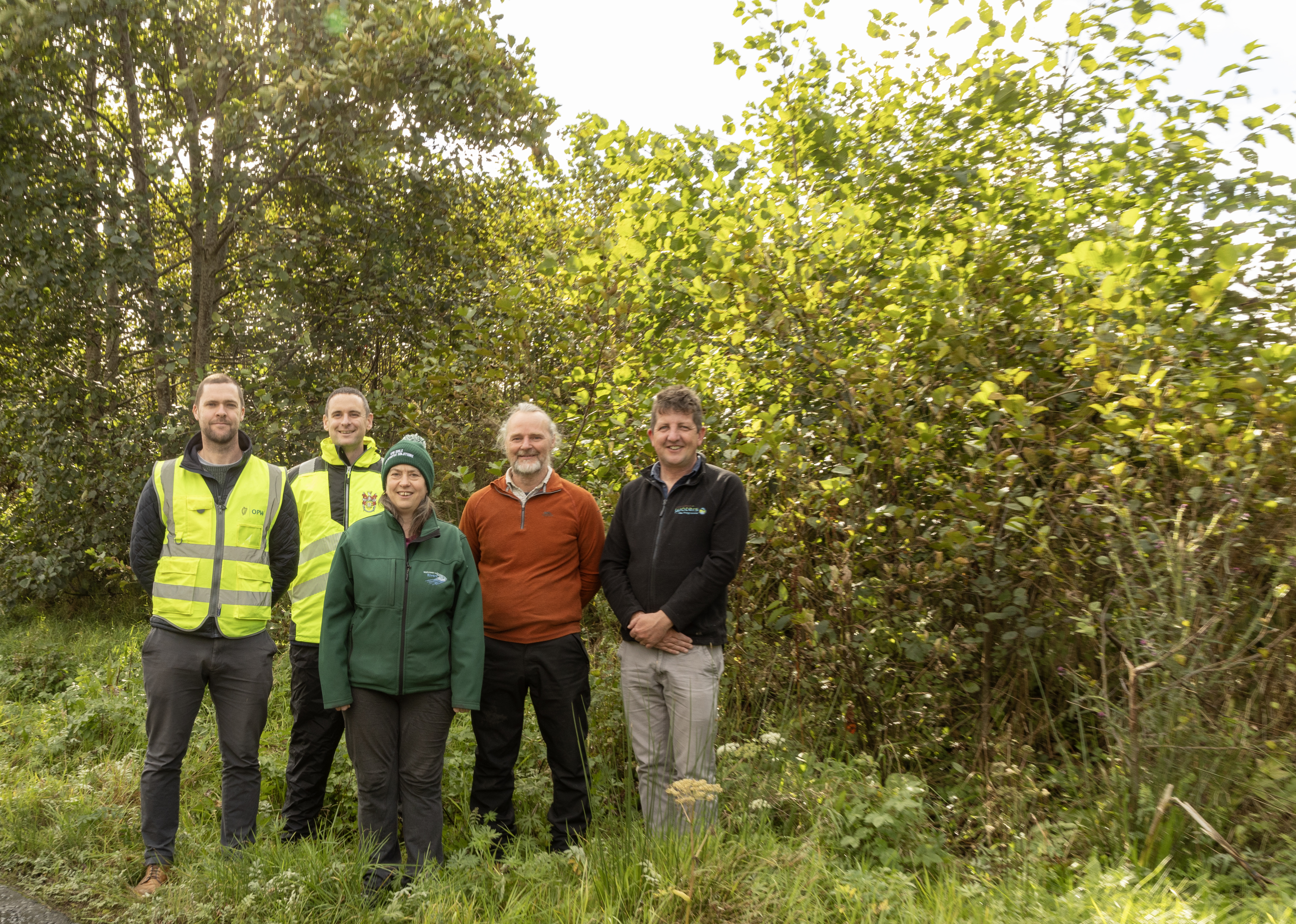Picture at one of the KNOT pilot sites (L to R), Gareth McKane, OPW; Shane McMonagle, DCC; Claire and Kevin Moore, KPM Soils and; Jimmy McVeigh, LAWPRO. Photo by NW News Pix
