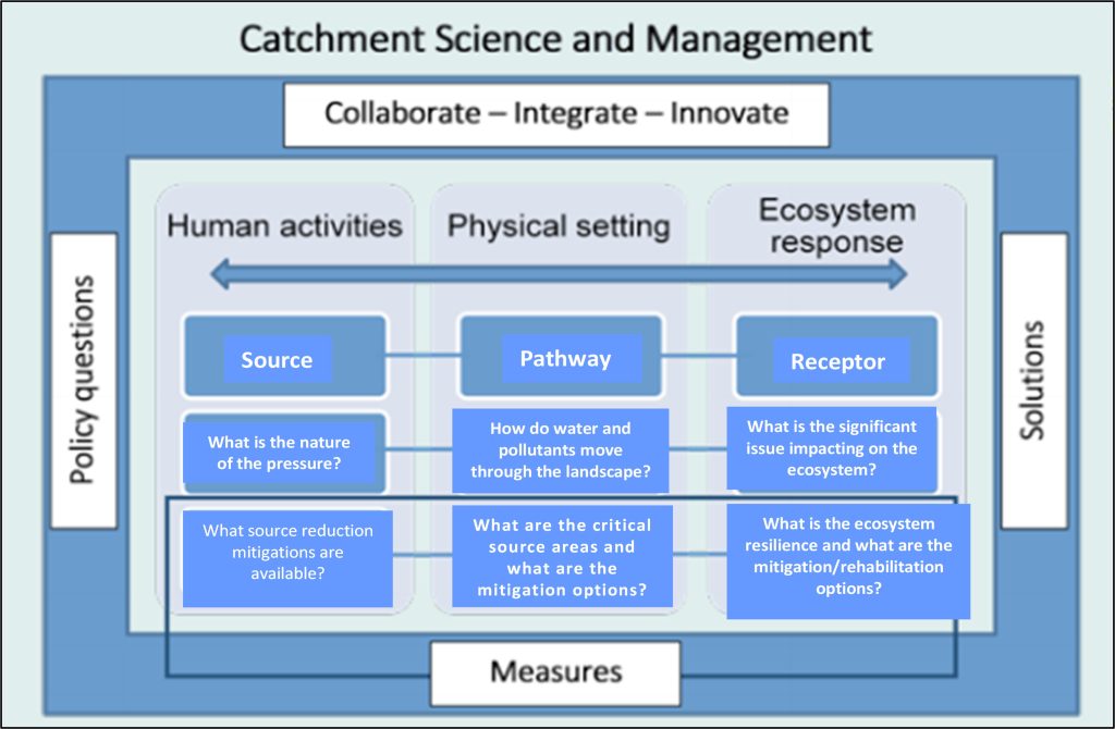 Catchment science is the study of the dynamic interactions between the physical catchment landscape, the ecosystems that sit within that landscape, and the human activities that can cause impacts to ecosystems in that landscape (Deakin, 2017). These three elements are all linked within the source-pathway-receptor (SPR) framework, which is illustrated in the diagram below. Therefore, catchment science is critical to providing the understanding mentioned above.