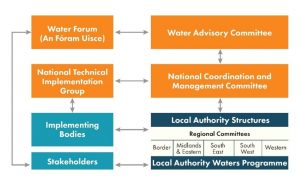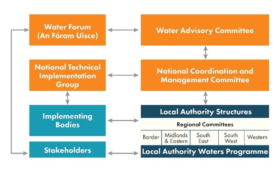 The three tier governance structure steers water policy formation and implementation. This structure has facilitated greater collaboration and knowledge transfer across the relevant public bodies and stakeholders. The governance structure is key to the success of ongoing efforts to achieve the water quality goals of the Water Framework Directive in Ireland.
